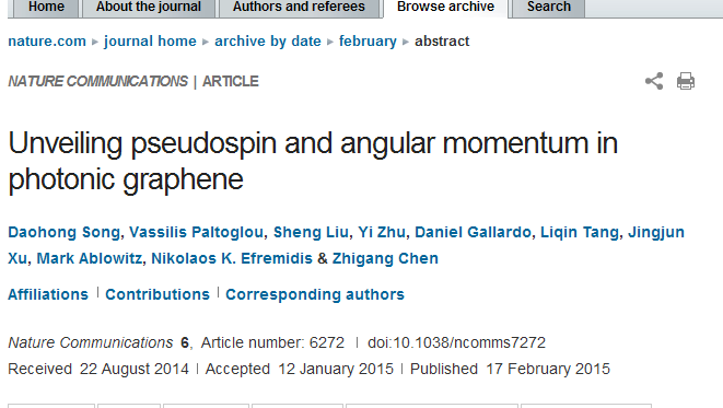近日,由陈志刚、许京军、宋道红研究组完成的有关光子石墨烯方面的科研成果在Nature子刊《Nature Communications》(自然·通讯)上发表。题目为“Unveiling pseudospin and angular momentum in photonic graphene”。