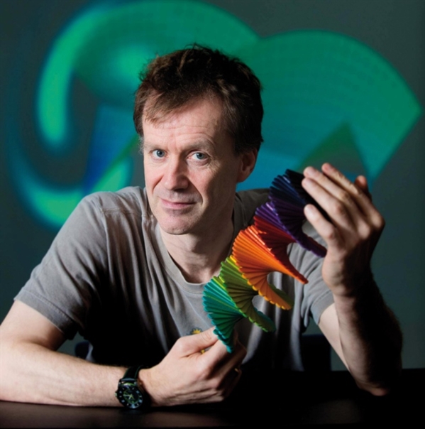 物理学家Miles Padgett拿下悬挂在他位于英国格拉斯哥大学办公室天花板上的一个像彩虹一样五颜六色的螺旋形物体,开始描述关于扭曲光的概念。随后,他停顿下来,在房间里搜索了更多的道具:晚餐盘、纸张、铅笔,甚至还有圣诞节剩余的巧克力。