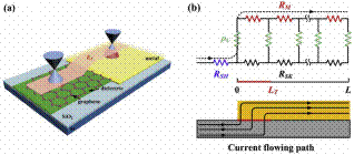 石墨烯与金属电极之间的接触电阻会影响石墨烯射频器件的栅控,从而对器件的频率特性产生不利影响。作为传统薄膜材料研究方法的延伸,目前主要通过TLM方法对石墨烯和金属之间的接触进行表征和测量。四室研究团队通过测定石墨烯接触区和非接触区材料的薄膜电阻,发现两者有很大的差异。进一步的理论分析表明,石墨烯不同区域薄膜电阻的差异会导致传统的TLM方法提取得到的接触电阻与实际值有很大偏差,该发现对测试方法的改良和石墨烯射频器件性能的优化具有重要价值。