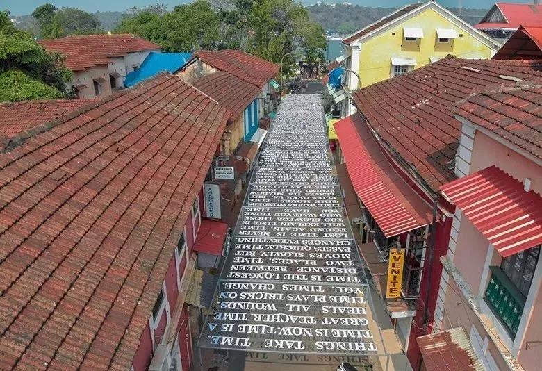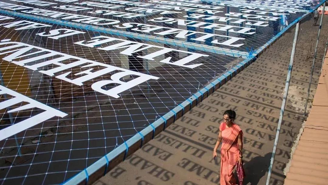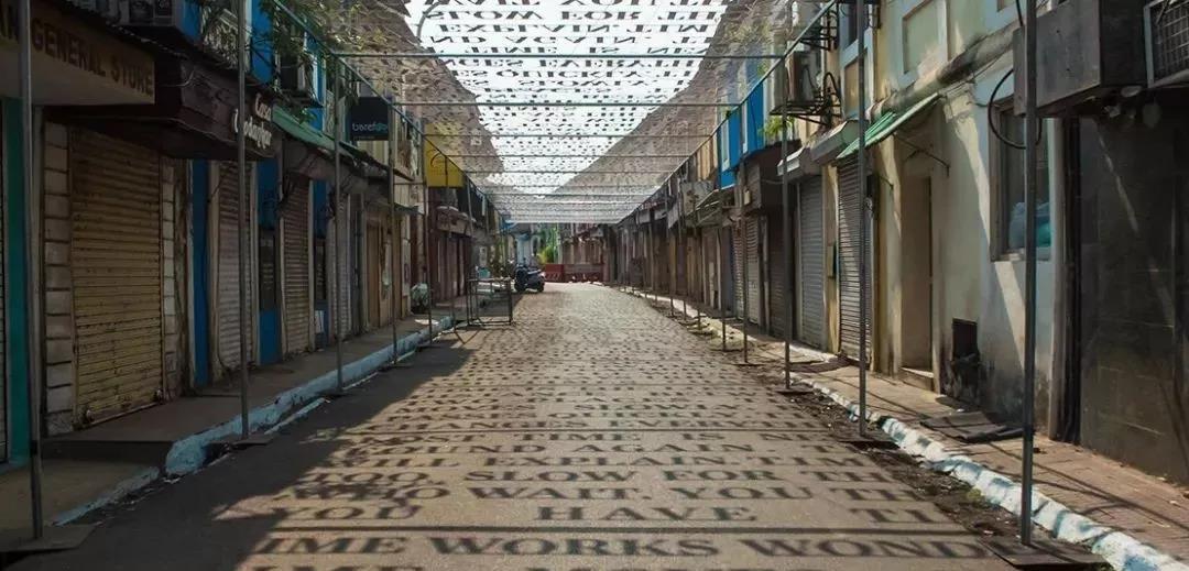 随着暖阳升起,DAKU 的艺术装置也仿佛有了生命。 《时间论Theory of Time》布置在印度某条街道上方,一层渔网上放置着满满的文字,当日光向下倾泻投射,地面上就会出现文字的影子,而人们行走于街道时,就能看到一连串诸如「时间会产生奇迹。时间是流动的。时间飞越我们,而遗留下它的影子。时间消逝。时间是一种错觉。」等等关于时间的短句,光影、空间的变化与文字意涵相互呼应,带出时间的多元样貌。