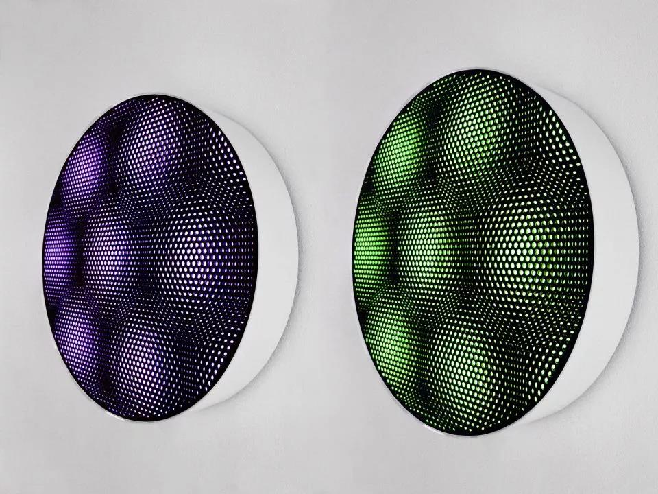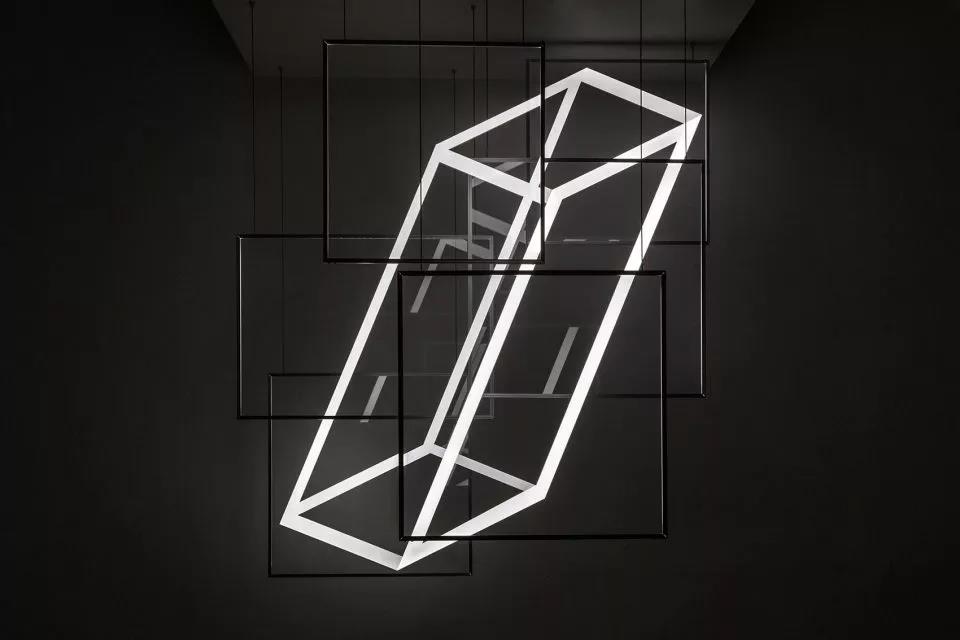 Hans Kotter的光学艺术作品展示了光学可能性的多重宇宙,它们突破了空间的边线,使得空间在物质与非物质之间徘徊。Kotter通过他的作品,创造了一个虚幻的世界。这个世界里人们不仅能分辨出光的物理维度,还能通过技术精准的材料组合来控制人们的感知。