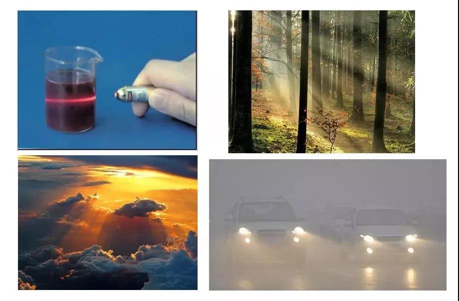 弹性散射中还有一种中学里介绍过的现象:丁达尔效应。其实它也是一种很常见的散射现象,例如光透过云层的时候,早晨透过森林的时候,甚至雾霾时车灯发出的光束,都能看到光的线条。当然如果没有散射的话,你是根本看不到任何光束的,比如你直接看水或者溶液,它都是透明的,没有任何光线。