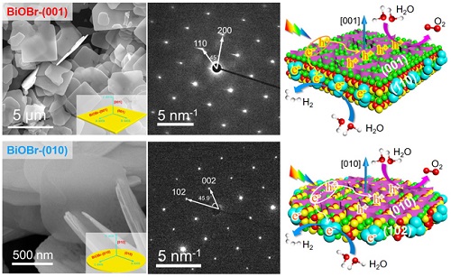 虽然半导体光催化材料的形貌和晶面调控被证明是提高光催化性能的有效途径之一,但关于形貌和晶面如何影响光催化性能仍然众说纷纭,研究人员往往将光催化活性的差异归结于所谓的高活性晶面,但对于活性晶面本质的认识并不清楚。本工作中,研究团队基于前期对晶面间光生电荷分离的研究基础,以典型的氧溴化铋(BiOBr)半导体为研究模型,分别可控合成了两种具有特定晶面的BiOBr纳米晶。研究发现,具有特定晶面暴露的纳米晶的光催化活性差异并不直接与高暴露比例的晶面性质关联,而是和与之共同暴露的晶面性质密切相关,这些与之共存的晶面暴露比例虽小,但其存在真正决定了高暴露比例晶面在光催化反应中所表现出来的性质。由于低暴露比例晶面和高暴露比例晶面表面能带弯曲程度的差异会诱导光生电荷在不同晶面之间发生空间分离,且由于共存晶面的不同导致晶面间光生电荷分离性质的差异,直接影响了纳米晶在光催化反应中表现出不同的催化性能。该研究工作进一步澄清了半导体光催化剂晶面依赖的光催化反应的本质,对于深入理解半导体纳米光催化剂的光生电荷分离和催化反应机制具有重要的科学价值。