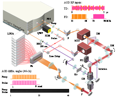 为了解决这一挑战,华中科技大学武汉光电国家研究中心王平教授课题组和波士顿大学程继新教授以及南洋理工大学徐臣杰教授课题组合作,研制成功了基于共线多光束(COMB-SRS)的受激拉曼散射显微镜,该显微镜可实现2000帧每秒的超高速高分辨化学成像,能够对剧烈的聚合反应过程进行无标记、原位的分子成像。COMB-SRS显微镜使用任意波形发生器同时产生多路RF射频,驱动两个声光偏转器(acousto-optic deflectors,AODs)获得可高达100路以上的高斯光束梳,并将多路泵浦光和斯托克斯光进行精确的时空和空间匹配,结合一维高速振镜,实现2000 Hz的SRS光梳的并行阵列扫描。聚焦到样品后的多路Pump光光束进行反相位的振镜扫描补偿后由光电二极管阵列进行并行探测。COMB-SRS采用高灵敏度的Lock-in Free电路阵列对微弱的非线性SRS信号进行检测,取代了传统单通道的锁相放大器。目前,COMB-SRS显微镜的视场(FOV)为30×28μm2,具有50×46像素,能够以亚微米的空间分辨率和亚毫秒的时间分辨率,通过测定拉曼峰对超快的聚合反应进行定量的动力学成像。通过丙烯酰胺聚合反应中化学键的变化,该方法对单体和聚合物的浓度进行成像,并且通过精确控制UV光的开关,对聚合反应的发生,扩散和终止进行了成像,并且原位观察到由反应速率和持续UV光引发驱动的聚合物波的图像。