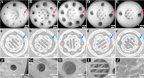 3D打印仿哈弗斯骨结构生物陶瓷支架形貌表征,(A-C)不同哈弗斯管直径和数量支架的光学显微镜照片,(a-c)不同哈弗斯管直径和数量支架的micro-CT图像,(F-H)不同直径哈弗斯管的电镜照片,(I)松质骨结构电镜照片,(J)支架表面烧结情况电镜照片。