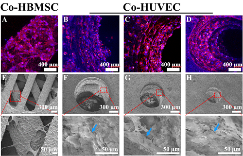 仿哈弗斯骨结构支架用于体外多细胞递送,(A-D)共培养的骨髓间充质干细胞和内皮细胞负载于支架表面的共聚焦照片,(E-H)共培养的骨髓间充质干细胞和内皮细胞负载于支架表面的电镜照片,(I-J)在不同哈弗斯管直径及数量的支架上生长的单培养及共培养细胞的增殖情况,(K-L)支架负载的单培养及共培养细胞成骨、成血管基因的表达情况。
