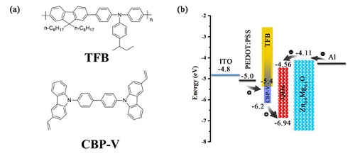 图1 (a)聚合物空穴传输材料TFB和交连型小分子空穴传输材料CBP-V的化学结构式;(b)器件能级结构及电荷传输示意图。