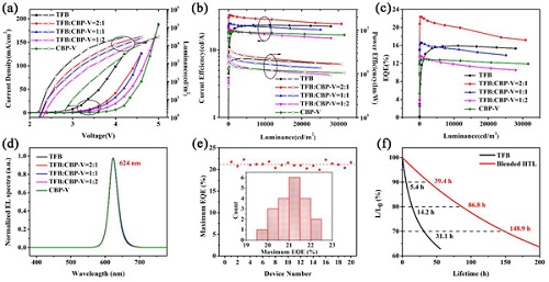 图2 采用不同混合比空穴传输层的红光QLED器件的(a)J-V-L曲线、(b)CE-L-PE曲线、(c)EQE-L曲线和(d)电致发光光谱;(e)20个混合空穴传输层器件的最大EQE统计直方图;(f)TFB器件与混合空穴传输层器件的寿命曲线。