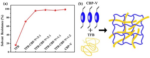 图3 (a)不同混合比的空穴传输层薄膜的抗溶剂性;(b)混合空穴传输层交连过程的示意图。