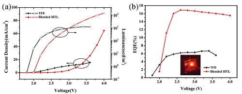 图4 基于TFB和混合空穴传输层的喷墨打印红光QLED器件的(a)J-V-L曲线和(b)EQE-V曲线