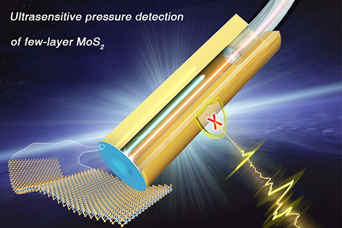 近年来,以二硫化钼(MoS2)为代表的一系列二维层状纳米结构的出现为发展高性能F-P传感器提供了新的可能。清华大学吕瑞涛课题组使用电子束蒸镀的方法,在二氧化硅/硅基底上蒸镀了一定厚度的钼薄膜,随后在常压进行硫化,得到了少层MoS2薄膜。最后将制得的薄膜转移到陶瓷插芯上,组装得到了基于不同层数MoS2的F-P传感器,并与北京航空航天大学李成课题组和美国宾夕法尼亚州立大学 Mauricio Terrones课题组合作开展了传感器性能研究。研究表明,基于少层MoS2组装得到的F-P传感器具有明显的应力-应变响应以及非常高的探测灵敏度(89.3 nm/Pa),与目前已报道的传统材料(二氧化硅、银薄膜等)相比提高了近三个数量级。该器件优异的压力探测性能可归因于少层MoS2机械强度较高、超薄、柔性和力学稳定性好的优点。这项研究对于开发超灵敏声压探测器提供了重要的启示,同时也拓展了二维材料在环境和生物医学等领域的应用。