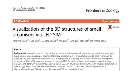 近日,我所瞬态光学与光子技术国家重点实验室超分辨成像创新团队与中科院动物所杨星科团队合作,成功将研发的结构光照明显微镜应用于微小动物的快速高分辨三维形态复原,为生物演化、分类(科)、外来物种鉴别等生物形态学深入研究提供了直接的科研证据。该研究成果于2016年6月正式发表在Frontiers in Zoology杂志上,我所但旦博士为文章共同第一作者。
