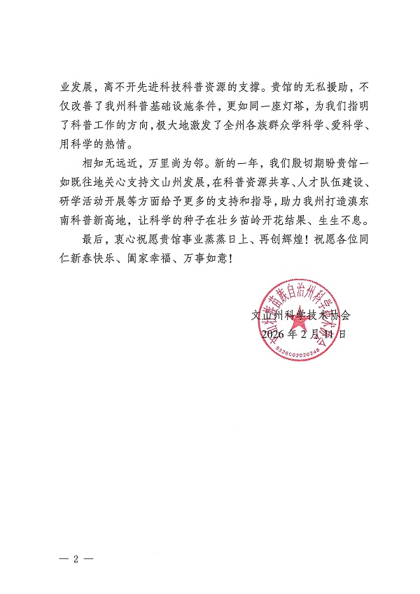 文山州科协在信中表示,我馆的无私援助为当地科普工作指明方向,极大激发了各族群众学科学、爱科学、用科学的热情。