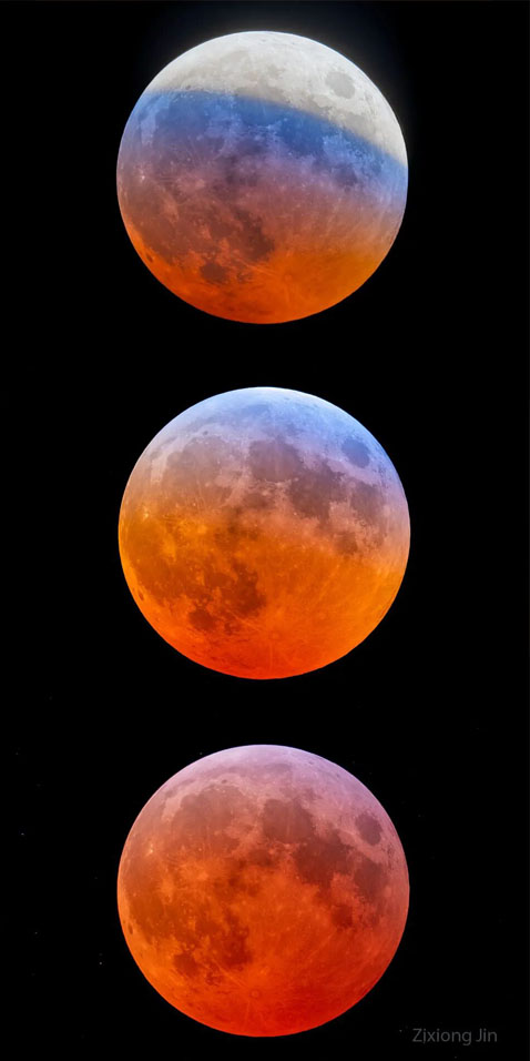 另一大看点是所谓的“血月”。月全食期间,月亮并不会彻底变黑,而是会呈现出古铜色、橙红色甚至暗红色的色调。其成因在于地球大气层对阳光的折射与散射。当太阳光穿过地球边缘厚厚的大气层时,短波长的蓝光被大量散射,只剩下红橙色的光线能够穿透并弯曲进入地球本影区,最终被投射到月球表面。换句话说,月亮此时沐浴的是来自地球各地日出与日落的霞光集合体。这与俗称“达芬奇光”的地照在视觉上有些相似,但成因不同:“血月”的光源于地球大气对太阳光的折射,而地照则是地球反射阳光后照亮月球暗面。
