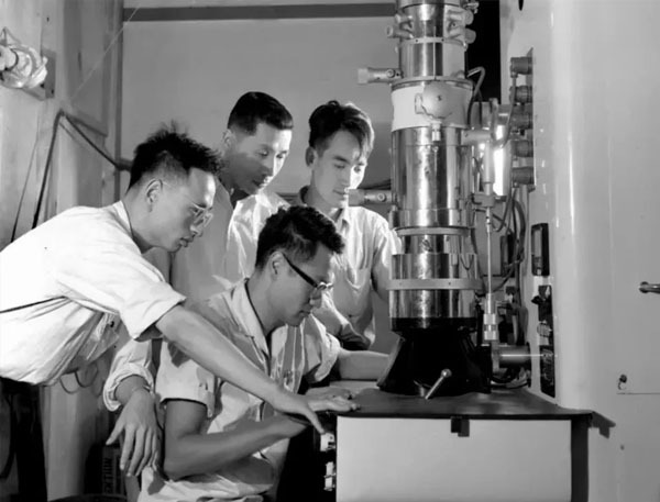 1958-1959年,姚骏恩任电子显微镜设计小组组长和课题负责人,参与研制我国第一台自行设计的电子显微镜XD-100型(左一姚骏恩)。